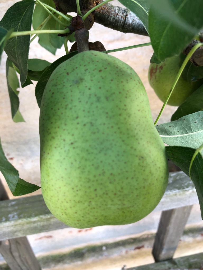 - Frucht: Groß bis sehr groß, bei überreicher Tragbarkeit nur mittelgroß, glockenförmig, gelbgrün, später hellgelb